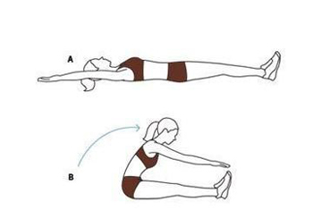 Động tác thứ 2: Bạn nằm ngửa trên sàn, 2 tay duỗi thẳng sau đầu, bật thân trên dậy, tay gần chạm mũi chân. Hít thở đều đặn khi nâng người lên thì thở ra, hạ ngưởi xuống thì hít vào, Thực hiện 3 lần mỗi lần 10 đến 12 cái.
